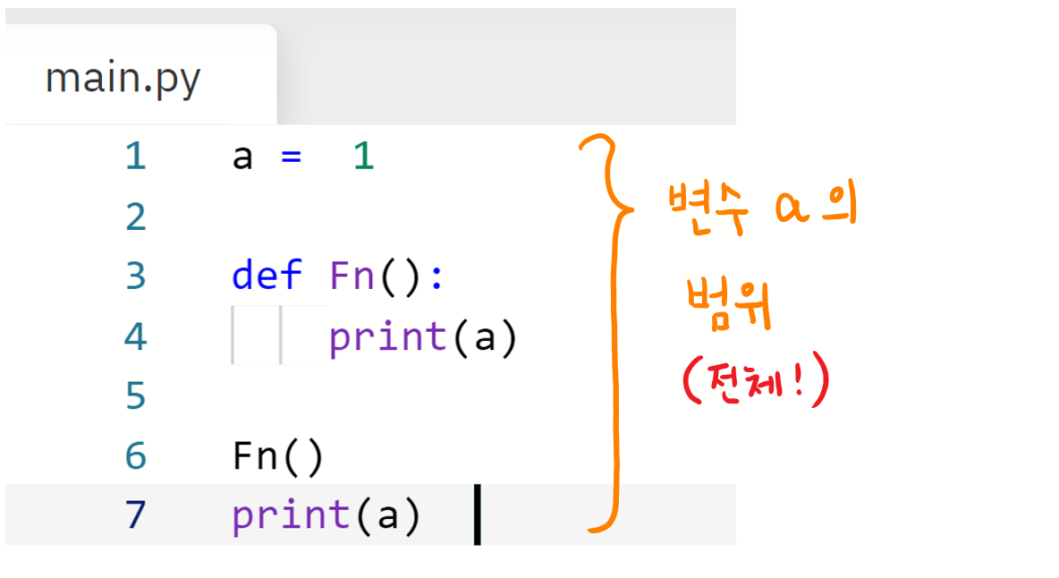 8번째 줄 : print(a) --> 이 명령은 a를 출력하는 것인데 a는 첫 번째 줄의 a = 1 (전역 변수)를 가리키게 된다. (함수 Fn()과 무관)