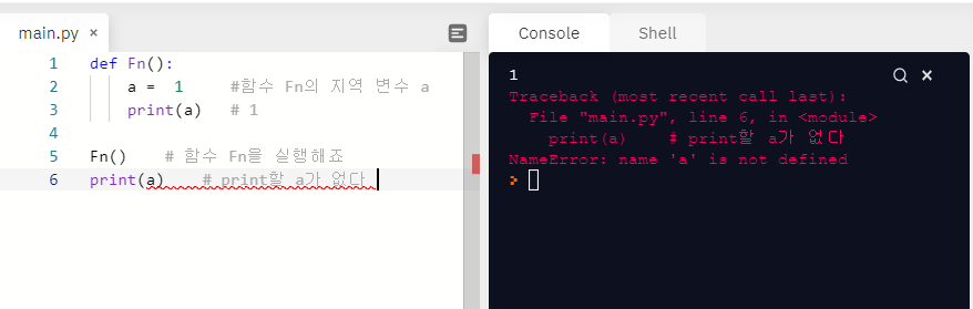그리고 6번째 줄의 print(a)는 실행 전에 이미 스크립스 상에서 빨간색으로 밑줄이 그어져 있다. print할 a를 찾을 수 없어서 console은 오류가 난다. a는 함수 Fn안에서만 선언이 되었기 떄문에 Fn()안에서만 영향을 끼친다.