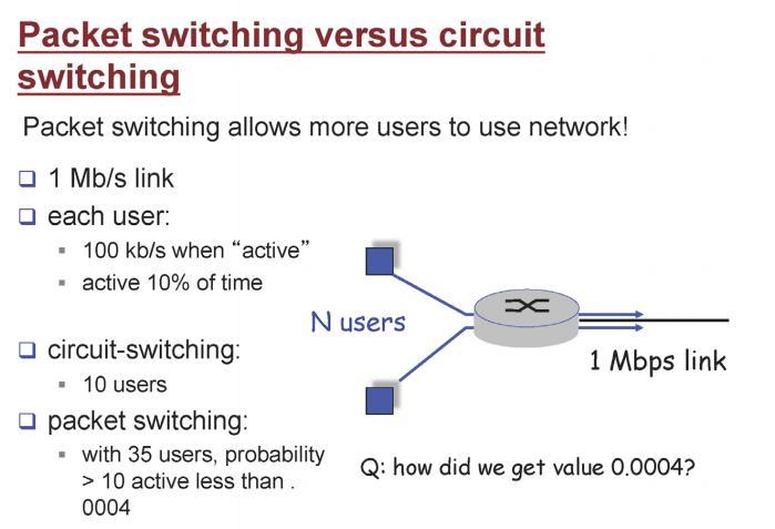 Packet switching은 제약이 없다. 10% 의 사용 확율로 약 35사용자가 잘 사용할 수 있다. 이 때 유저가 동시에 클릭하여 문제가 될 확율은 0.0004%로 매우 적다.