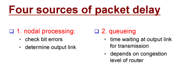 => 소스와 목적지 사이의 거리가 멀수록, 패킷이 중간에 더 많은 라우터를 지나갈수록, 트래픽의 양이 커질수록 버퍼에서 지연되는 패킷이 양이 커질수록 delay는 늘어난다.